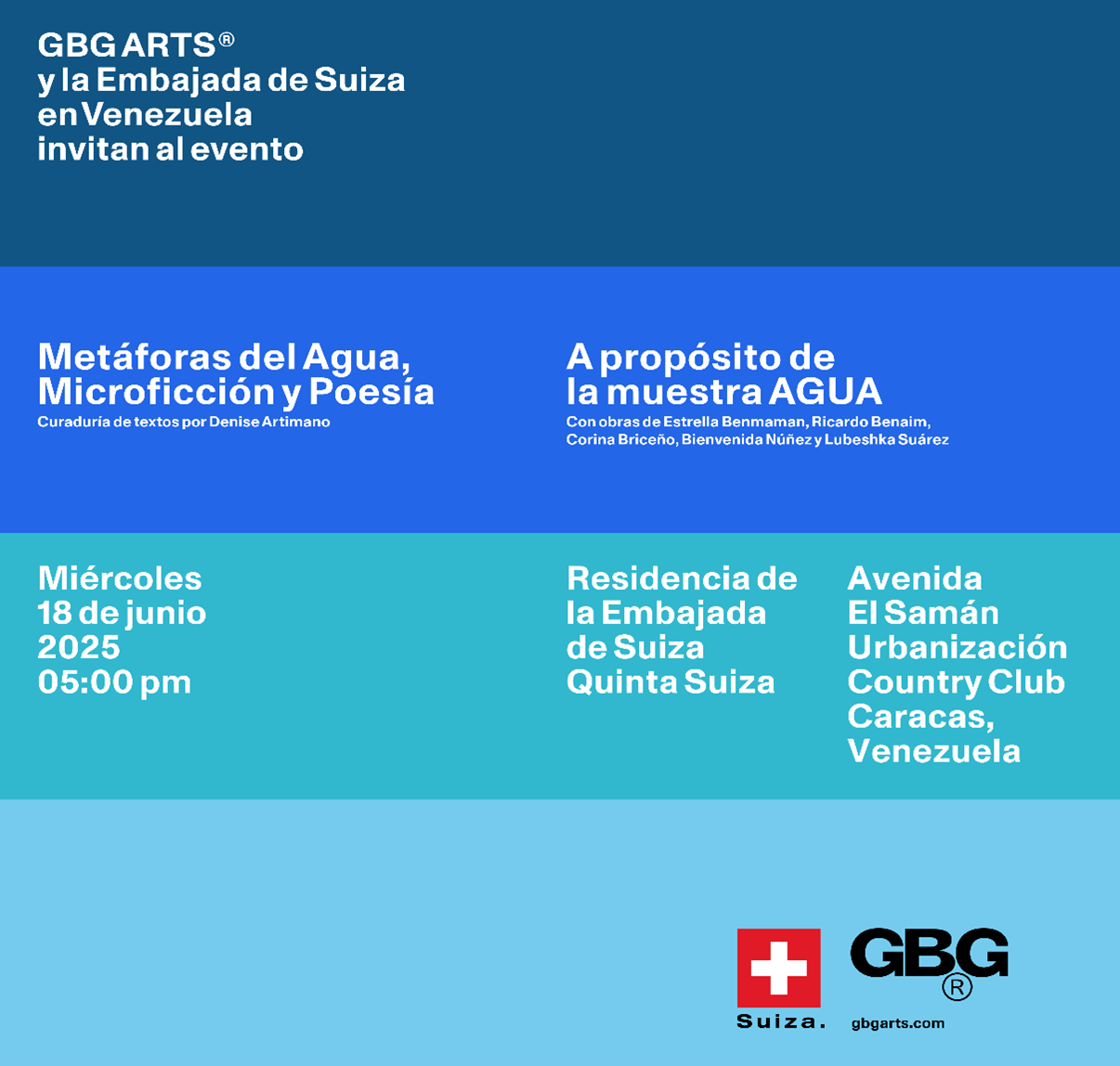 La Embajada de Suiza en Venezuela, junto a la galería GBG ARTS, organizó por primera vez un proyecto transdisciplinario que unió literatura y artes plásticas. El 18 de junio, sesenta invitados del mundo cultural, artístico y literario participaron en “Metáforas del Agua”, un recorrido comentado por obras visuales y lecturas de microrrelatos que puso en el centro la colaboración entre diplomacia y creación cultural.